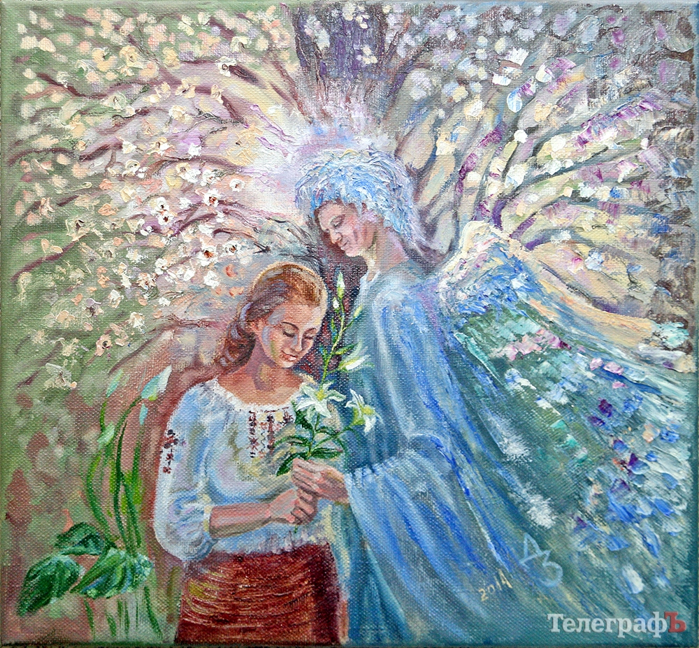 Як розповіла "Телеграфу" Зоряна Дашко, на картині "Благовільник" зображена дівчина у вишиванці, як символ нашої держави. Поряд з нею - ангел, який приносить їй гарну новину. Прямо як Діва Марія, коли у скрутні часи Бог зглянувся і також послав до неї ангела з доброю звісткою.
