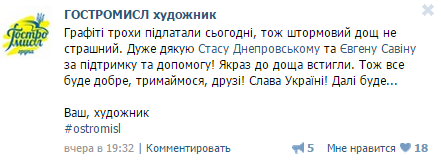 На днях в Кременчуге неизвестный повредил недавно восстановленное граффити Шевченко. Ввиду ожидаемых дождей с граффити нужно было срочно что-то делать, чтобы защитить его от дальнейшего разрушения, чем и занялся его создатель – кременчугский художник Сергей Брилев.