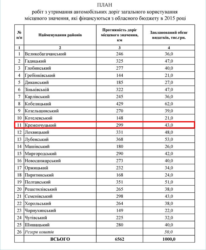 Згідно з планами, у Кременчуцькому районі планують відремонтувати 299 км доріг (зробити ямковий ремонт). Коштуватиме він - 43 тис. грн.