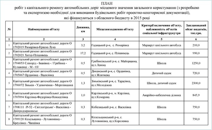 Затверджені плани робіт з капітального ремонту автомобільних доріг місцевого значення. Які фінансуються з обласного бюджету в 2015 році, на загальну суму 24275,9 тис. грн.: