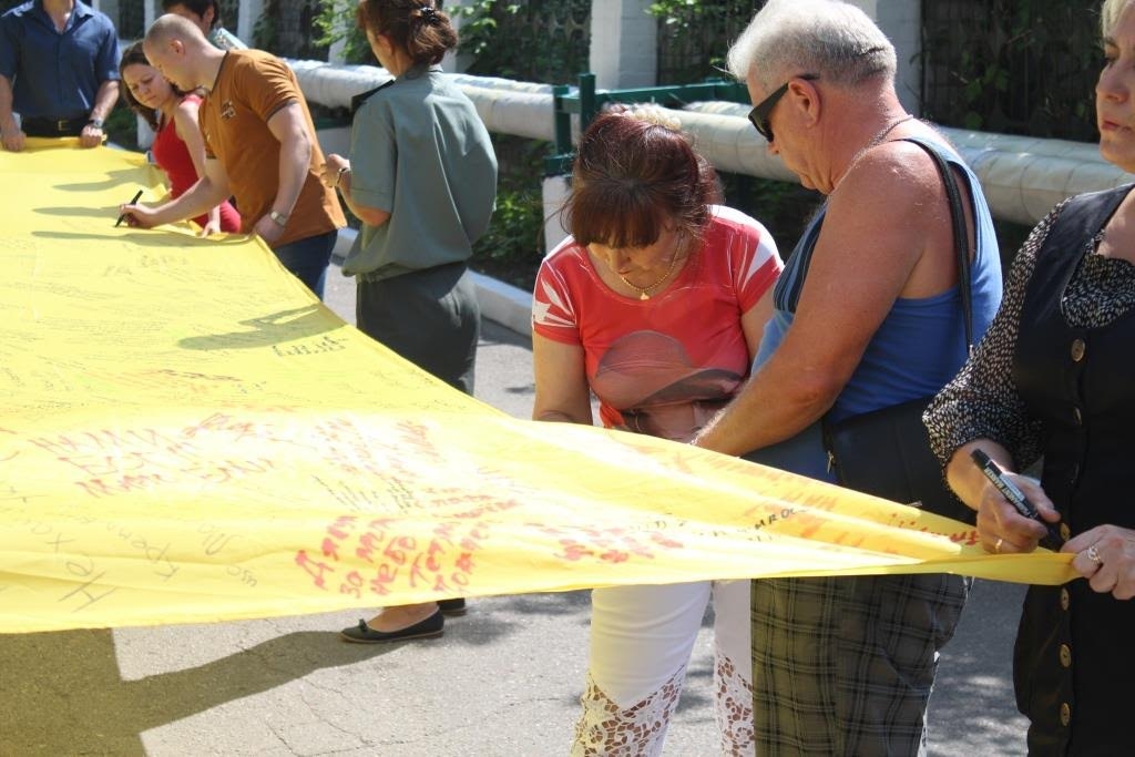 Перед адміністративним будинком виховної колонії розгорнули десятиметровий стяг. Співробітники, небайдужі до долі захисників, в єдинстві та з вірою у перемогу залишили воїнам побажання сили, терпіння і здоров'я на прапорі.