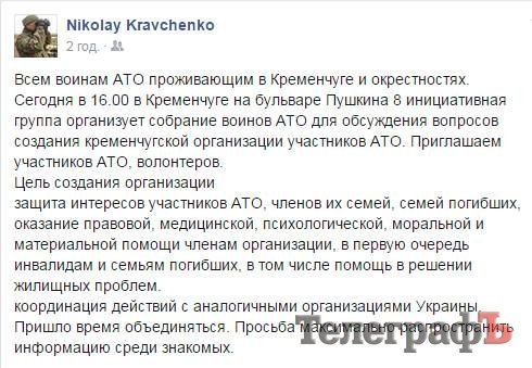 – Ми чекаємо на зустрічі усіх учасників АТО з Кременчука та району, у якому статусі вони не були б – добровольці, строковики, демобілізовані, усі. Зараз важливо об’єднати зусилля, бо ніде немає точної інформації, скільки військових є чи побувало в зоні АТО з Кременчука. Тому сьогодні ми просто зберемося, щоб встановити контакти, дізнатися скільки нас є. Чекаємо ще і на волонтерів та на членів сімей загиблих, бо у кожного з них є своя інформація, і, можливо, кожен потребує своєї допомоги.