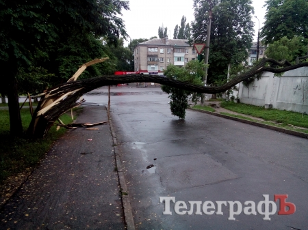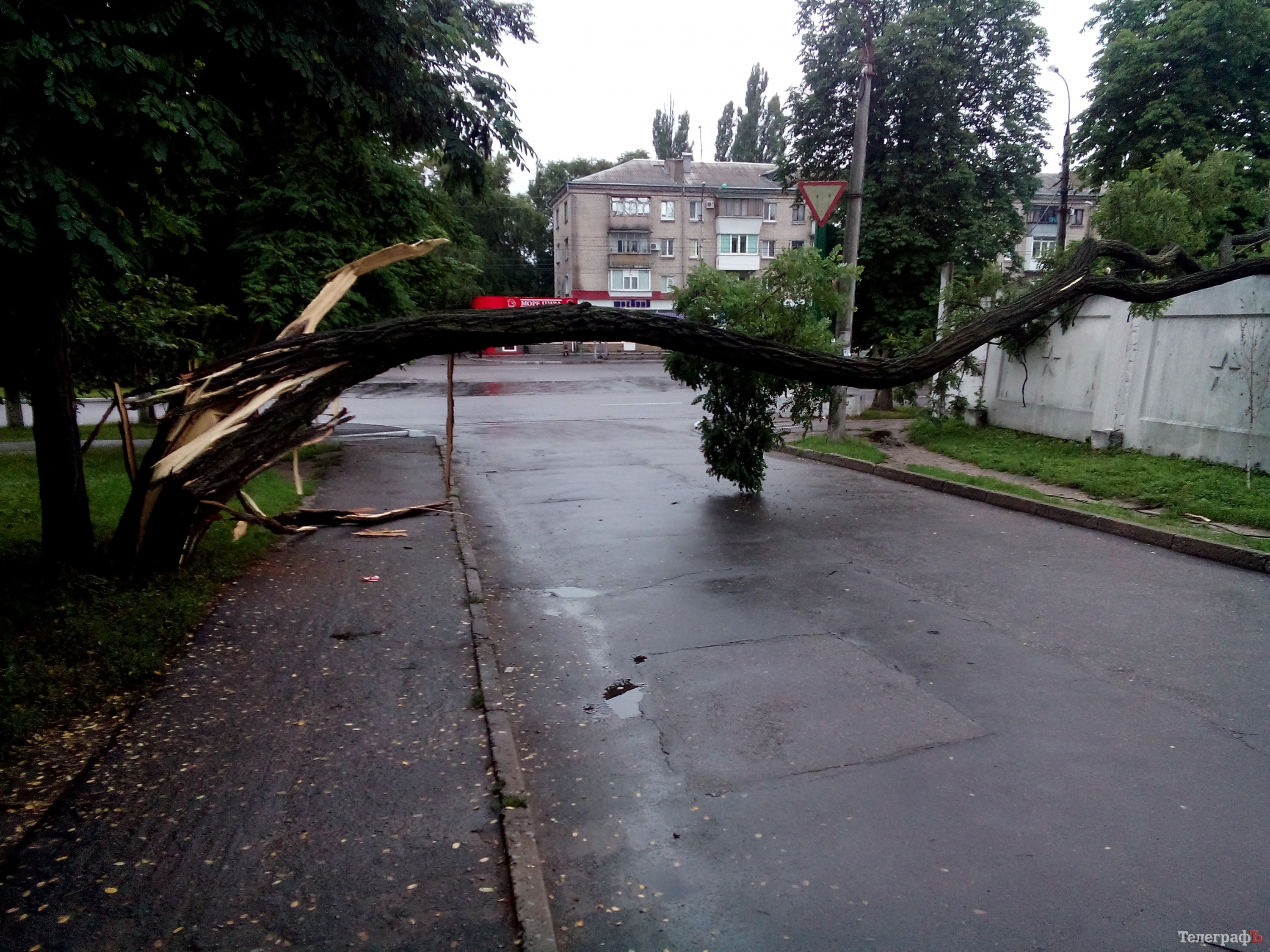 В Кременчуге на улице Родимцева в результате непогоды упало огромное дерево. Легковые автомобили аккуратно проезжают под "аркой".