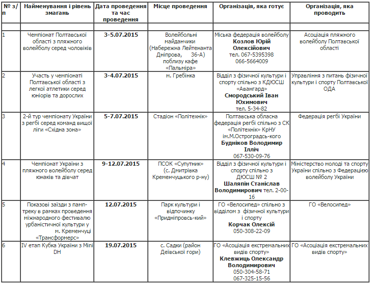План спортивных мероприятий в Кременчуге. Июль