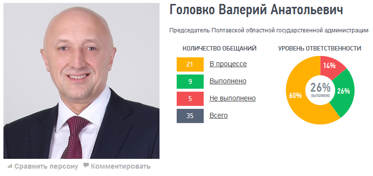 Губернатор Полтавской области на сегодняшний день имеет следующие показатели.