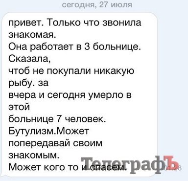 Вже добу (з 27 на 28 липня) Кременчуком ширяться чутки про масове захворювання на ботулізм у місті. Почалося все приблизно з такого повідомлення у локальних пабліках Кременчука в соцмережах.