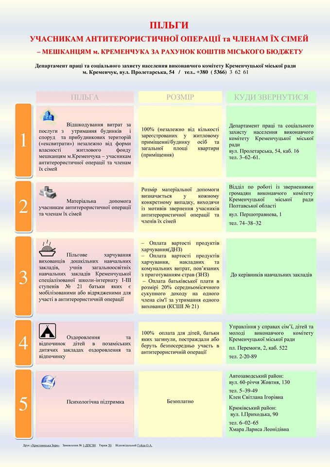 «Кременчугский Телеграф» также будет информировать о всех льготах и других видах помощи для участников АТО, а также членов их семей – следите за обновлениями на нашем сайте.