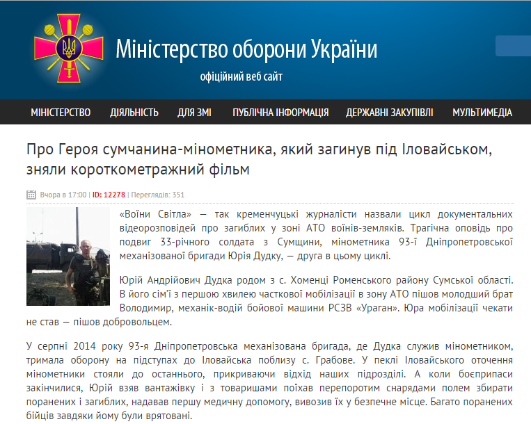 Про проект “Кременчуцького Телеграфу” “Воїни Світла”, присвячений кременчужанам, загиблим у зоні бойових дій, написали на сайті Міністерства оборони України. Другий короткометражний фільм про Юрія Дудку, який загинув в Іловайському котлі.