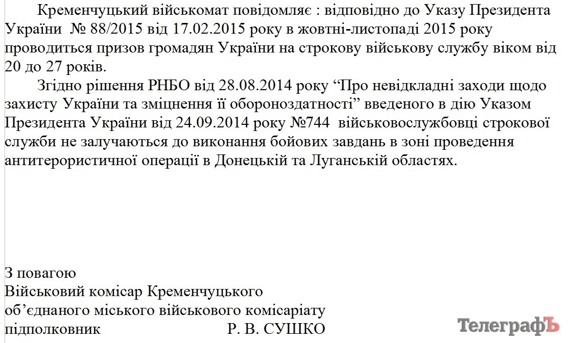 В октябре-ноябре 2015 года в Кременчуге, как и по всей Украине, будет проводиться призыв на срочную военную службу граждан возрастом от 20 до 27 лет, сообщает военком Кременчугского объединенного городского военного комиссариата Роман Сушко.