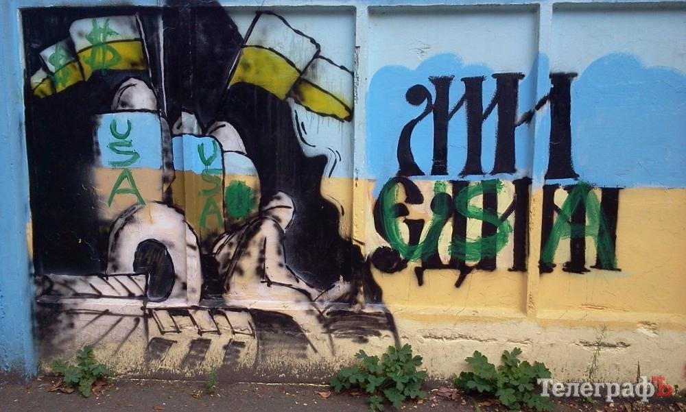 В этот раз стену граффити обмалевали зеленой краской. Как и в прошлый раз писун или писуны написали все, что думают по поводу единой Украины и вообще, правда в этот раз, «виновниками назвали» других.