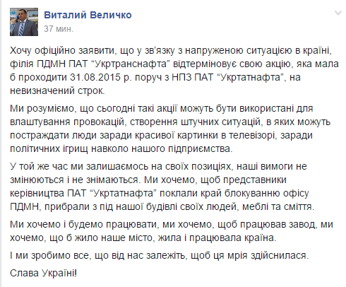 "Хочу официально заявить, что в связи с напряженной ситуацией в стране, филиал ПДМН ПАО "Укртранснафта" переносит свою акцию, которая должна проходить 31.08.2015 г. рядом с НПЗ ПАО "Укртатнафта", на неопределенный срок. <...>
