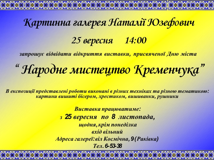 ЩО: Виставка "Народне мистецтво Кременчука", присвячена Дню міста. На виставці представлені зразки вишитих ікон, картин, рушників, сорочок, виробів з бісеру. За словами Алли Король, завідуючої картинною галереєю, в експозицію увійшло близько 40 робіт, виконаних в різних техніках та за різною тематикою.