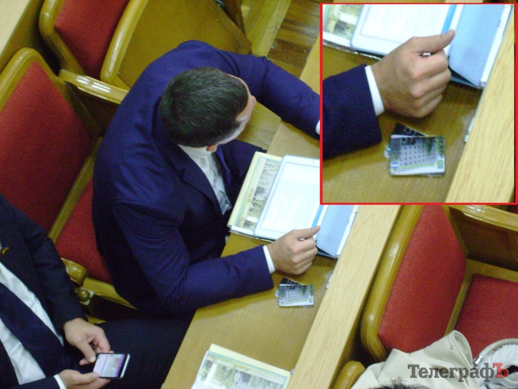 Потом он вынул карточки — свои и соседей и держал их в руках. Когда депутаты перешли к «Разному», где не голосуют, ему отдали свои карточки депутаты Николай Черныш и Ирина Федько. Геннадий Иванян стал развлекаться — тасовал карточки для голосования, как колоду карт под советы коллег: