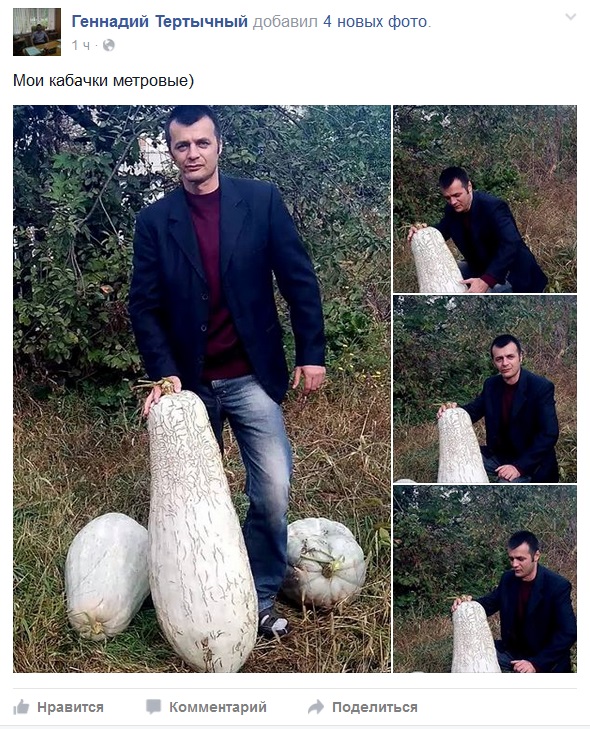 "Мои кабачки метровые", - написал активист у себя на стене и разместил "фотосессию" с овощами огромного размера.