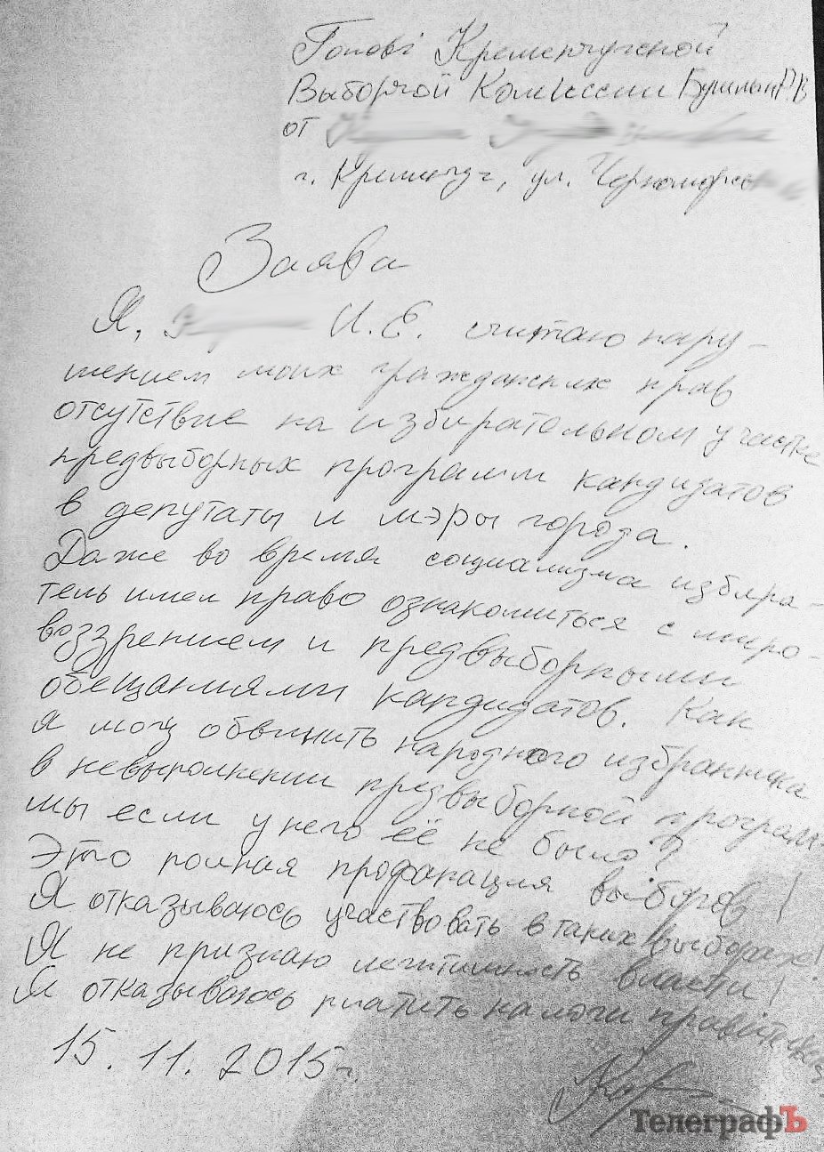 Как ранее сообщал «Телеграф», кандидатов в Полтавский областной совет кременчужане выбирали вслепую – у избиркома не было денег напечатать даже их перечень и вывесить для ознакомления на избирательных участках.