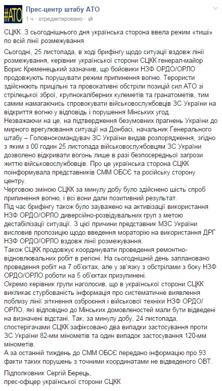 По данным пресс-центра Антитеррористической операции, начиная с полуночи 25 ноября распоряжением Начальника Генерального штаба Вооруженных сил Украины Виктора Муженко военнослужащие ВСУ не должны открывать огонь.