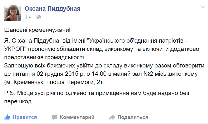 Депутат Кременчугского горсовета Оксана Пиддубная на своей странице в Фейсбук написала обращение к активистам. Она приглашает 2 декабря в 14.00 в малый зал исполкома №2, чтобы обсудить вопрос расширения состава исполкома: включить в него представителей общественности.
