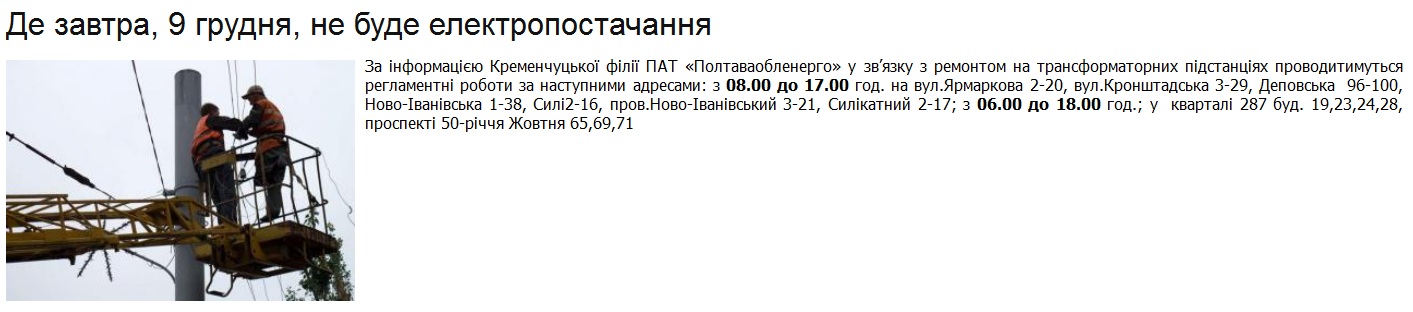 Завтра, 9 грудня, в Кременчуці без електроенергії..
