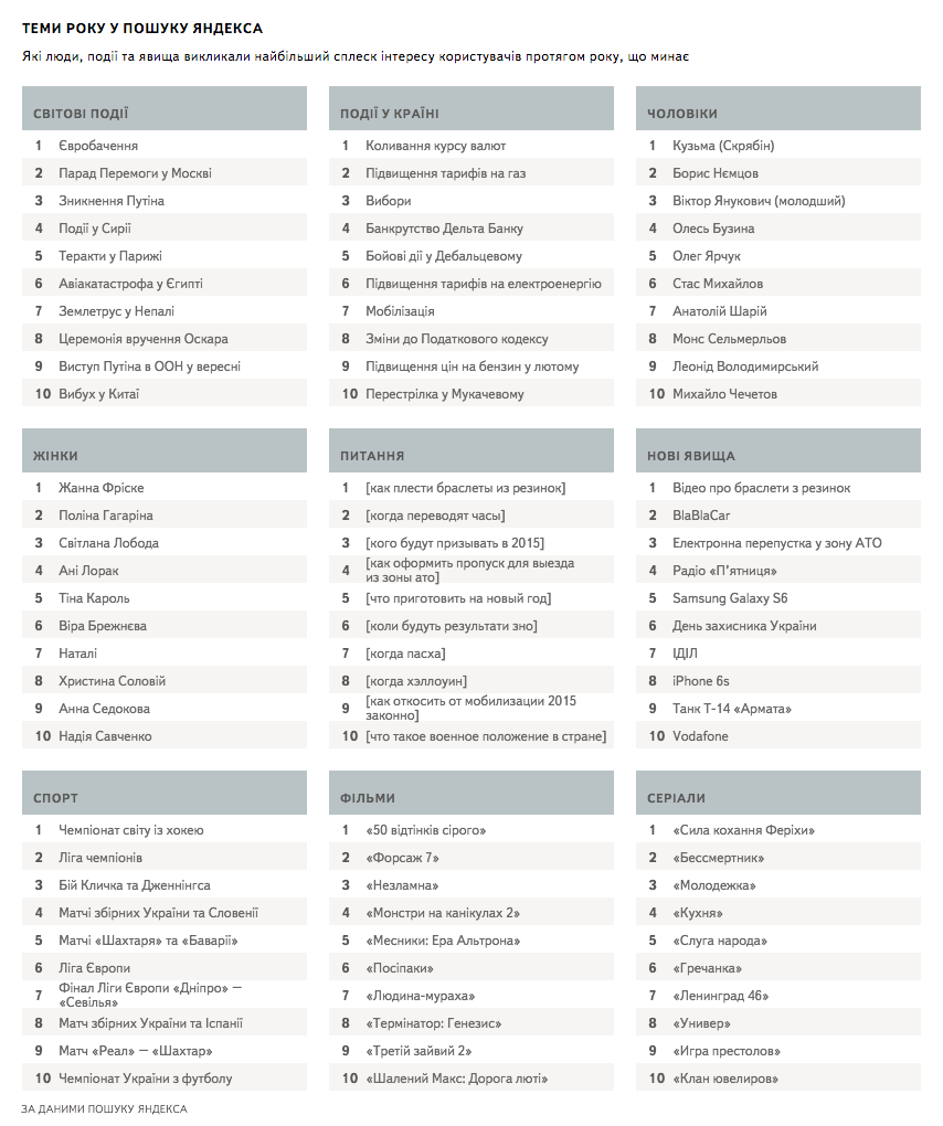 Пошуковий сервіс Яндекс проаналізував усі запити, які задавали мешканці Полтавщини (більшість з Кременчука та Полтави) впродовж 2015 року. Серед нових пошукових трендів BlaBlaCar, Vodafone та ІДІЛ, а також «вибухом» було зникнення Путіна.