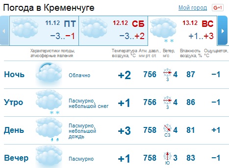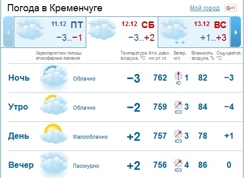 В субботу, 12 декабря, в Кременчуге ожидается переменная облачность без осадков. Ночью отметка термометра опустится до 3 градусов мороза, днем подымется до 2 градусов тепла. Об этом сообщает Гисметео.