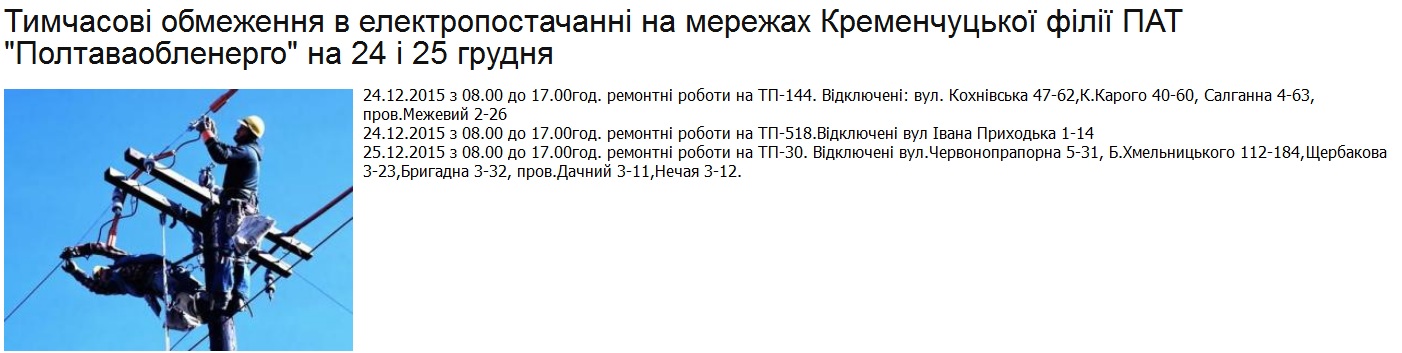 Сьогодні та завтра, 24 та 25 грудня, в деяких районах Кременчука, через планові роботи в електромережах міста, тимчасово буде відсутнім електропостачання.