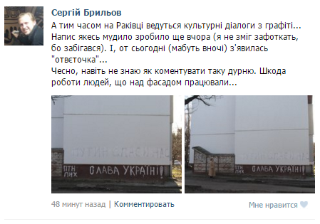 Как рассказал кременчугский художник Сергей Брилев, на следующий день кто-то написал «ответочку»: «ПТН-ПНХ, Слава Україні».
