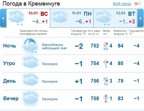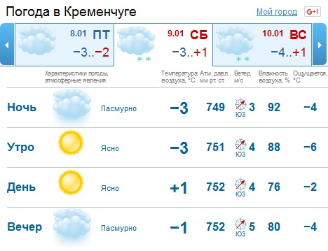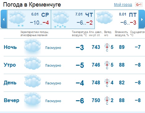 Сегодня, 4 января, ночная температура держалась отметки -15, днем мороз обещает не крепчать, но оставаться на отметке -11. Уже завтра, 5 января, ночью температура воздуха обещает быть на один градус выше, нежели предыдущей ночью, т.е. составит -14 градусов мороза. Днем во вторник, 5 января, мороз уменьшится до -9 градусов.