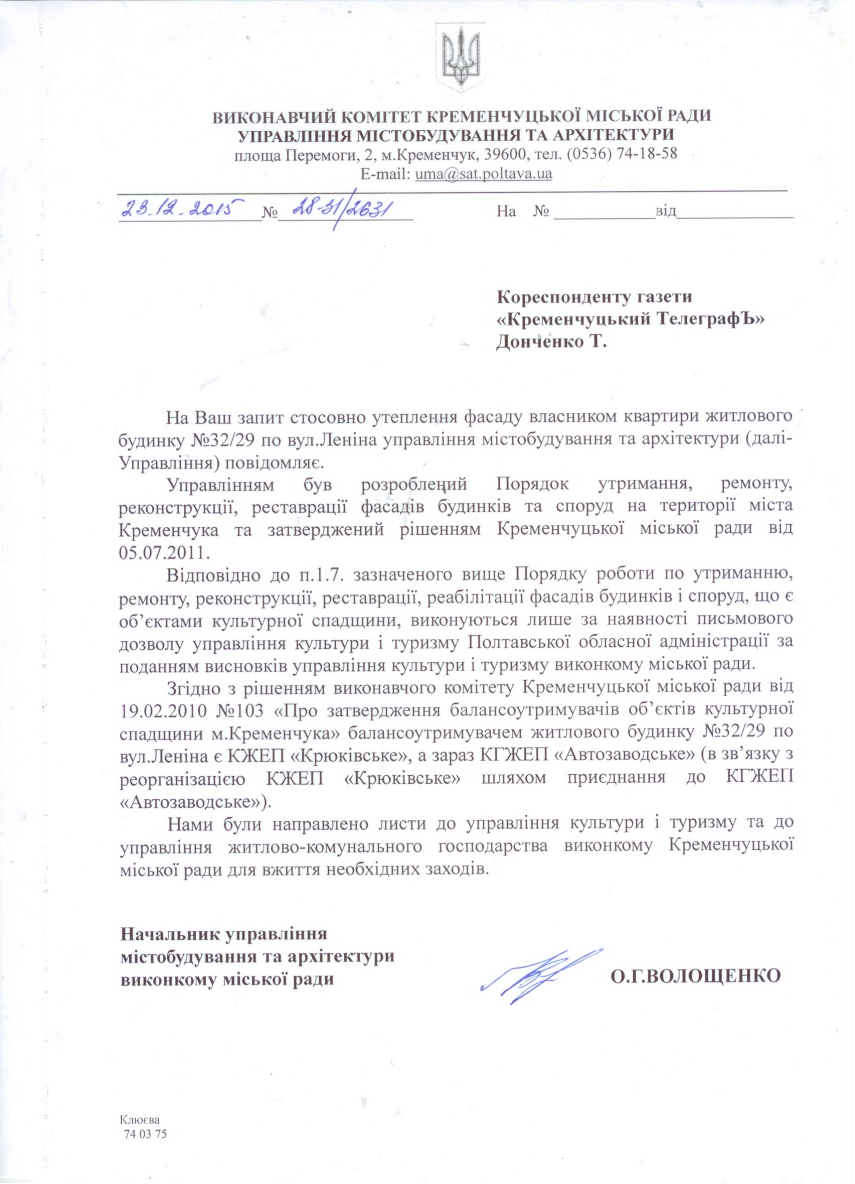 Мы получили ответ от начальника управления архитектуры Александры Волощенко. Из него мы узнали, что да, действительно, существует Порядок содержания, ремонта и реконструкции фасадов, утвержденный исполкомом. Работы по реконструкции, реставрации фасадов на объектах культурного наследия должны осуществляться лишь при наличии письменного разрешения управления культуры Полтавской облгосадминистрации при наличии выводов управления культуры и туризма исполкома Кременчугского горсовета.