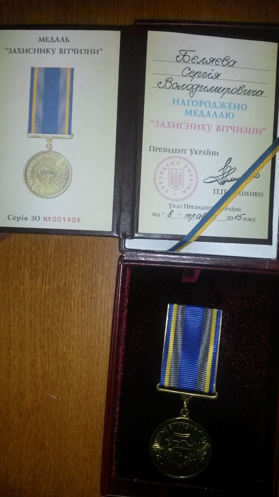 Заместитель военкома майор Сергей Покотило вручил солдату Сергею Беляеву медаль «Защитнику отечества». Приказ о награждении подписал Президент Украины Пётр Порошенко.