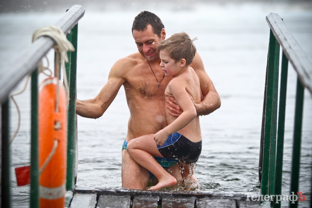 В основном малыши просто смотрели, как купаются родители и набирались опыта на будущее. Но 6-летний Артем - герой. Вместе со своим папой он залез в ледяную воду, и по его словам, даже не замерз.