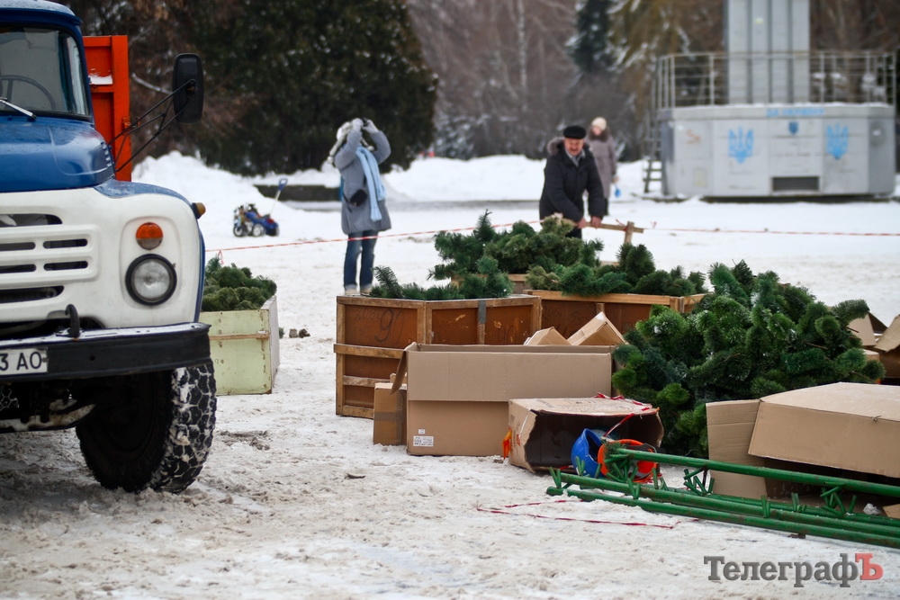 За словами керівника КП «Благоустрій Кременчука» Юрія Мокієнка, всі зусилля комунального підприємства були спрямовані на розчищення від снігових заметів зупинок громадського транспорту та пішохідних переходів. Крім того, Юрій Мокієнко говорить, що великі морози не дозволяли застосувати для демонтажу ялинки автовишку.
