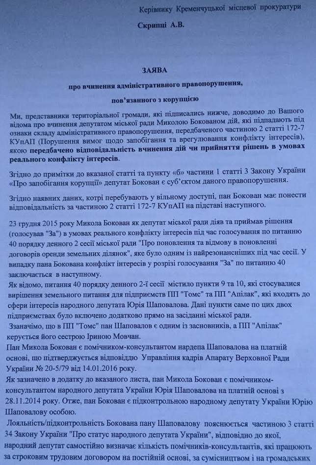 26 января в прокуратуру обратились депутаты Анна Павленко («Самопоміч»), Оксана Пиддубная («Укроп») и активист Леонид Харченко, глава общественной организации «Є-Майдан». Они просят составить протокол на депутата Кременчугского горсовета Николая Бокована (главу фракции партии «Поруч») за правонарушение, связанное с принятием решений в условиях конфликта интересов. (ч. 2 ст. 172-7 Кодекса Украины об административных правонарушениях, коррупционная статья).