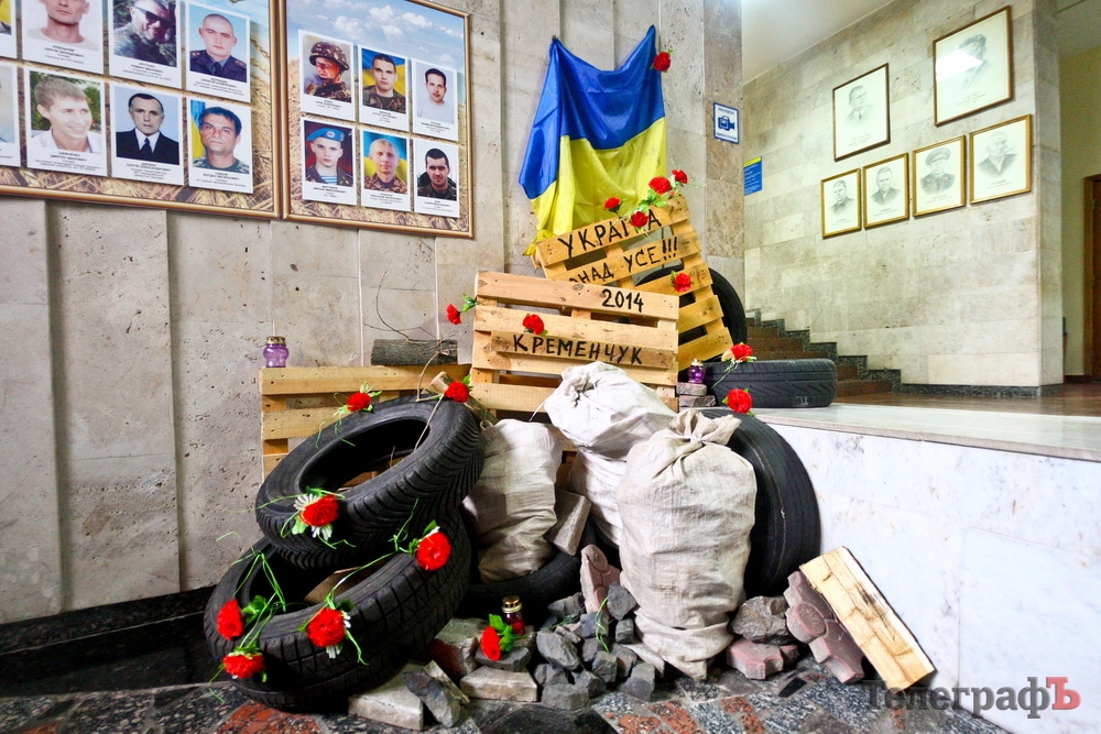 В мэрии Кременчуга соорудили баррикаду в честь подвига Героев Небесной Сотни. Несколько шин, мешков, досок, украшенные цветами и флагами Украины, установили рядом с портретами кременчужан погибших на Донбассе.