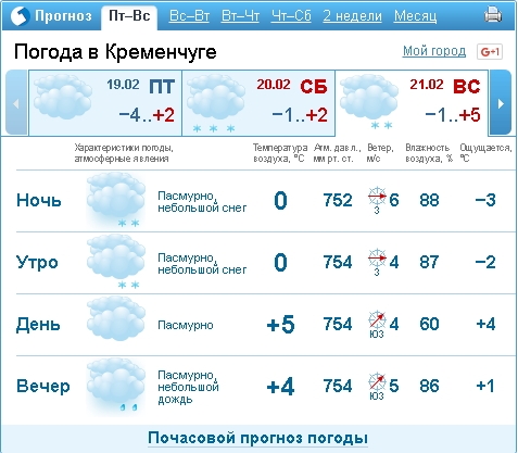 Некоторые ресурсы, такие как Синоптик, прогнозируют Кременчугу днем +5. Укринский Гидромецентр и Синоптик предвещают ясную погоду. Rp5.ua показывает небольшой снежок на утро субботы и вечер воскресенья. Гисметео обещает снег на всю суботу и воскресенье.