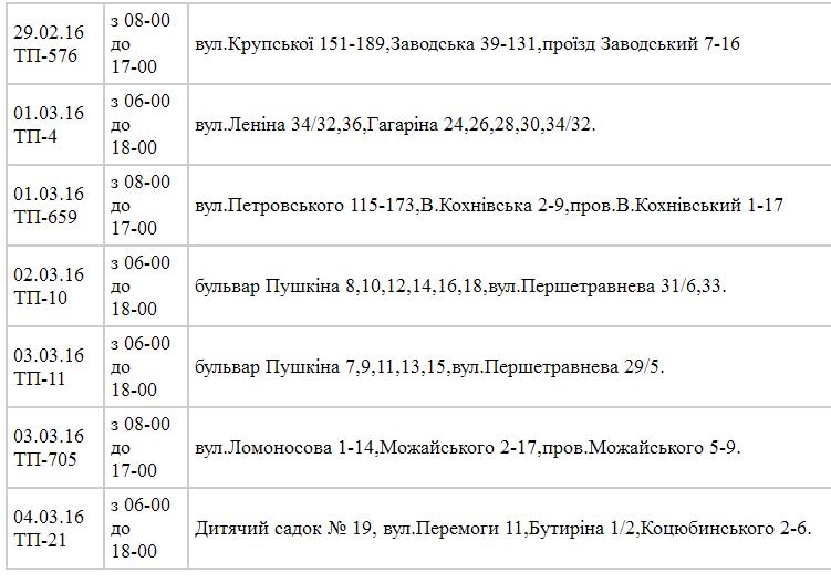 Через проведення поточних та капітальних ремонтів трансформаторних підстанцій та повітряних електромереж, у районі наступних вулиць Кременчука на наступному тижні з 8:00 до 17:00/18:00 години не буде світла: