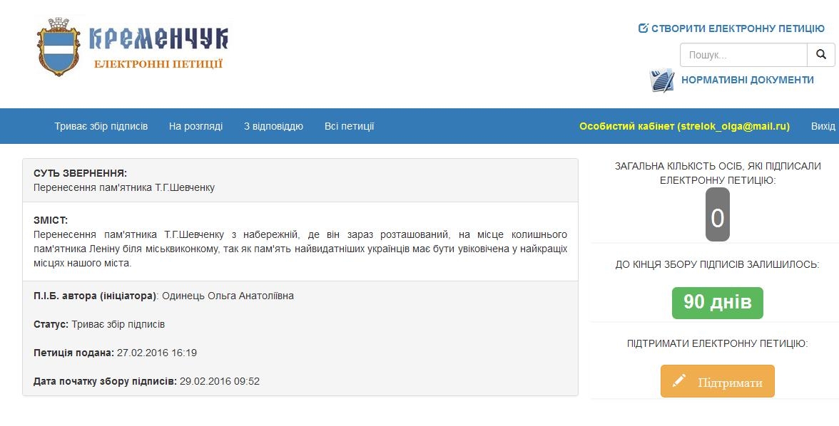 Кременчужани просять перемістити постамент Т.Г. Шевченку, розташований на набережній Дніпра навпроти річкового вокзалу Кременчука, на місце колишнього пам'ятника Леніну - площу Перемоги. Петиція з відповідним проханням нещодавно з'явилася на сайті мерії.