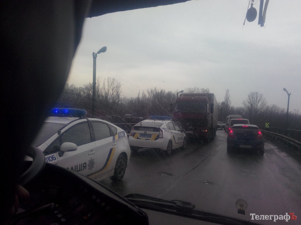 Как сообщает корреспондент «Телеграфа», у фуры во время движения лопнуло колесо. Пробка на мосту еще с 7.00.