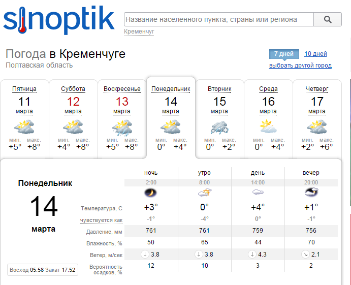В понедельник, 14 марта, температура в Кременчуге опустится до нуля