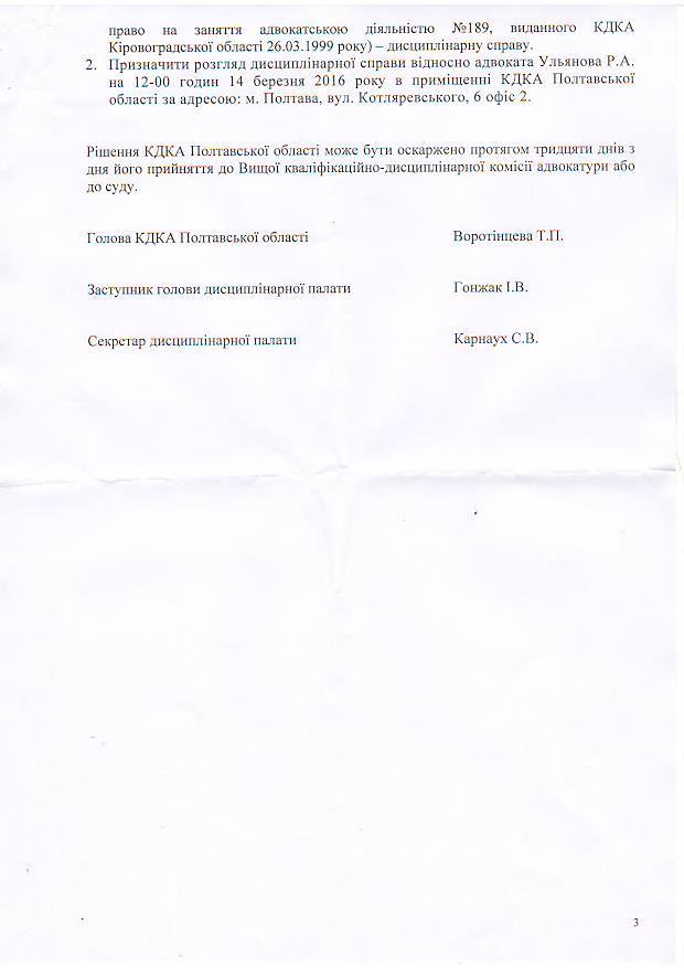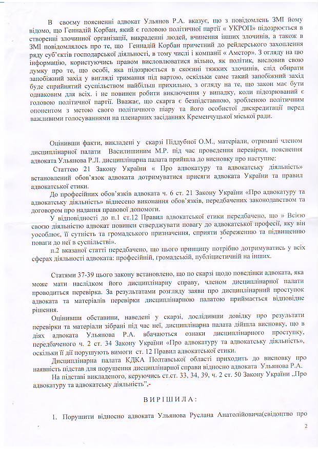 Руслан Ульянов повідомив “Телеграфу”, що не згоден з рішенням КДКА Полтавської області стосовно порушення проти нього дисциплінарної справи. І подав скаргу на її рішення до Вищої кваліфікаійно-дисциплінарної комісії адвокатури.