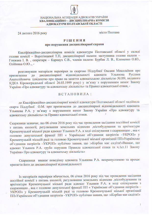 Кваліфікаційно-дисциплінарна комісія адвокатури (КДКА) Полтавської області завела дісціплінарну справу на адвоката Руслана Ульянова, який є депутатом міськради (БПП) за скаргою депутата Оксани Піддубної («Укроп»). Рішення дисциплінарної комісії виклала на своїй сторінці в Фейсбук Оксана Піддубна.