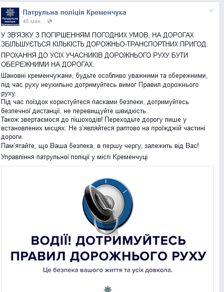 Кременчуцькі копи закликають громадян бути обережними на дорозі через погіршення погодних умов.