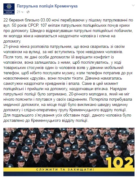 Ночью 22 марта у девушки на ул. Большая Набережная (ул. 50-летия СССР) трое парней украли мобильный телефон. Об этом на своей странице в Facebook сообщает патрульная полиция Кременчуга.