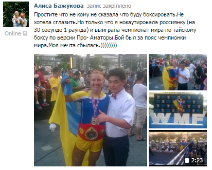 Чотирикратна чемпіонка України у фіналі завоювала пояс чемпіона світу у версії напівпрофесіоналів. Фінальний бій тривав 30 секунд. Кременчужанка ударом ногою нокаутувала росіянку.