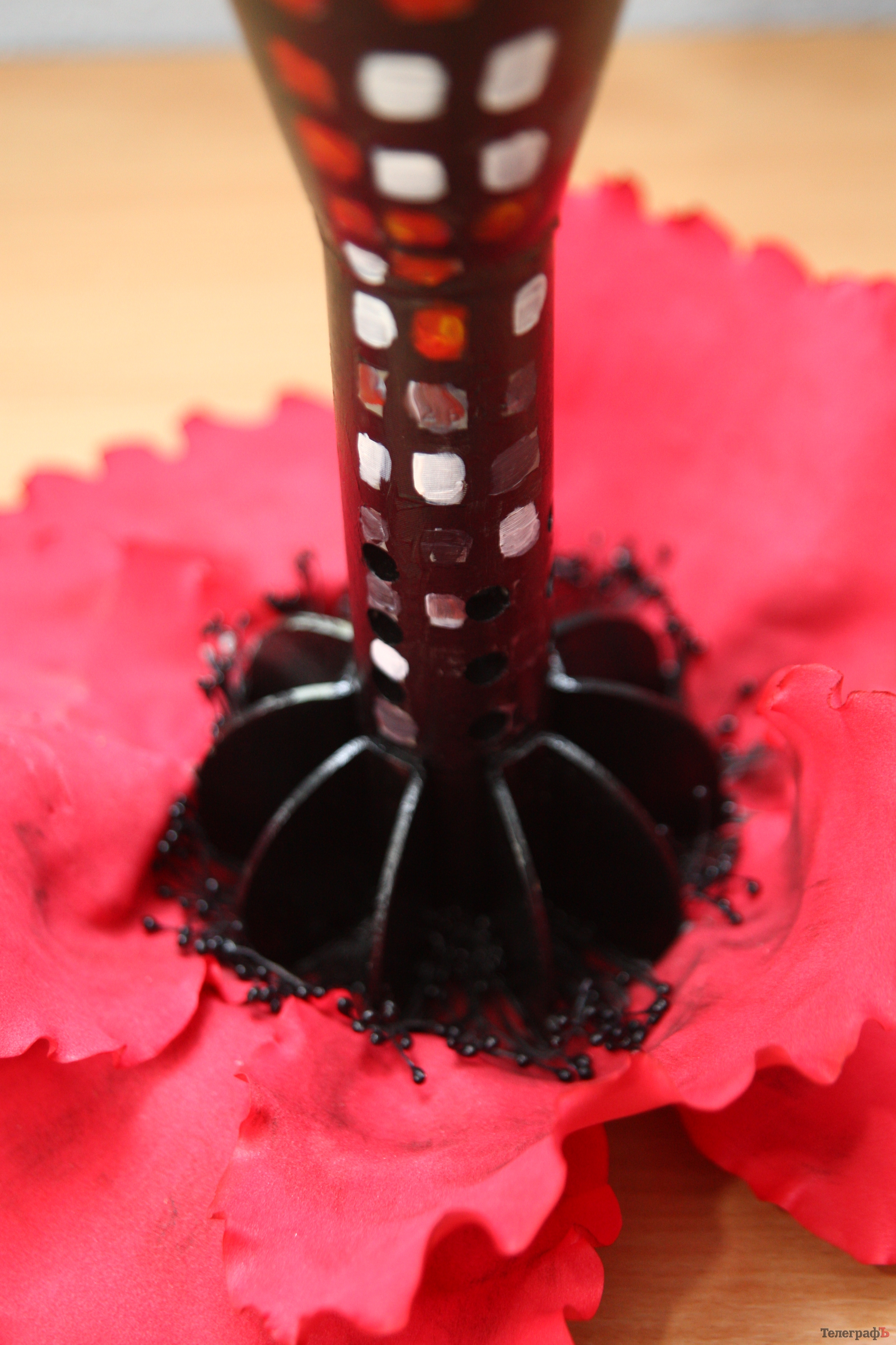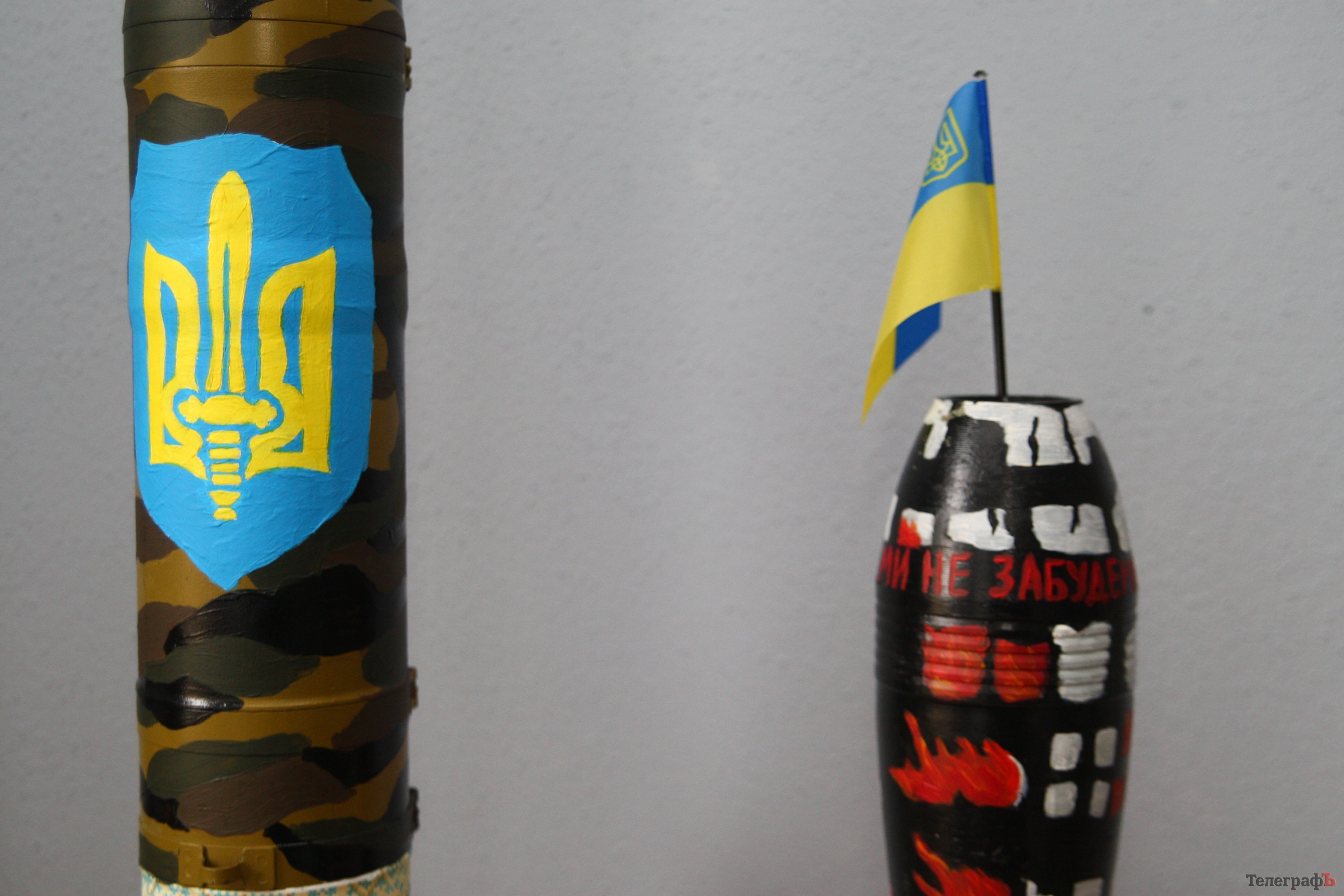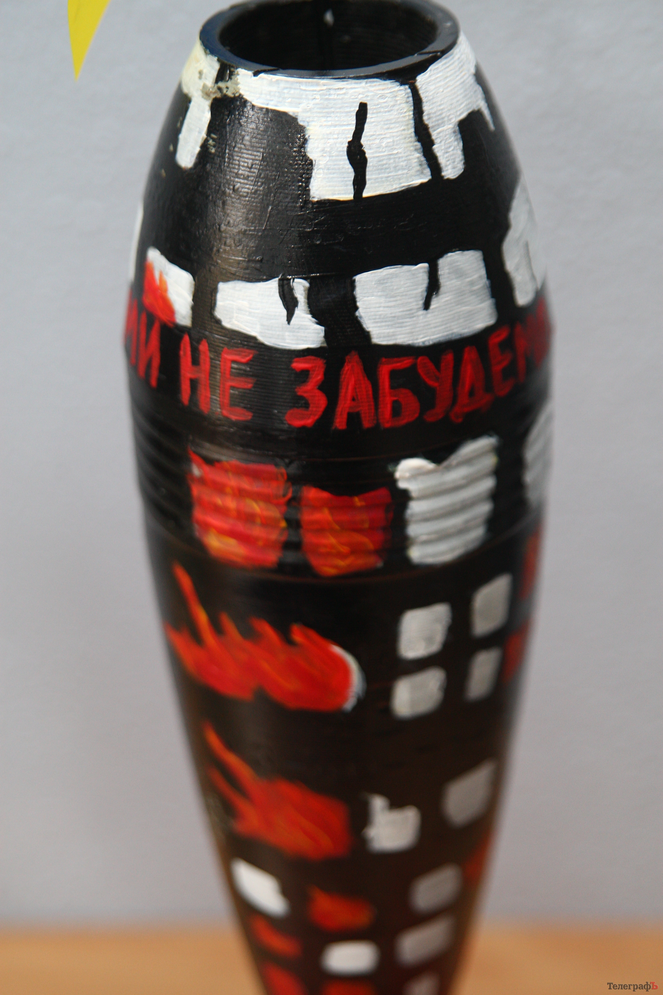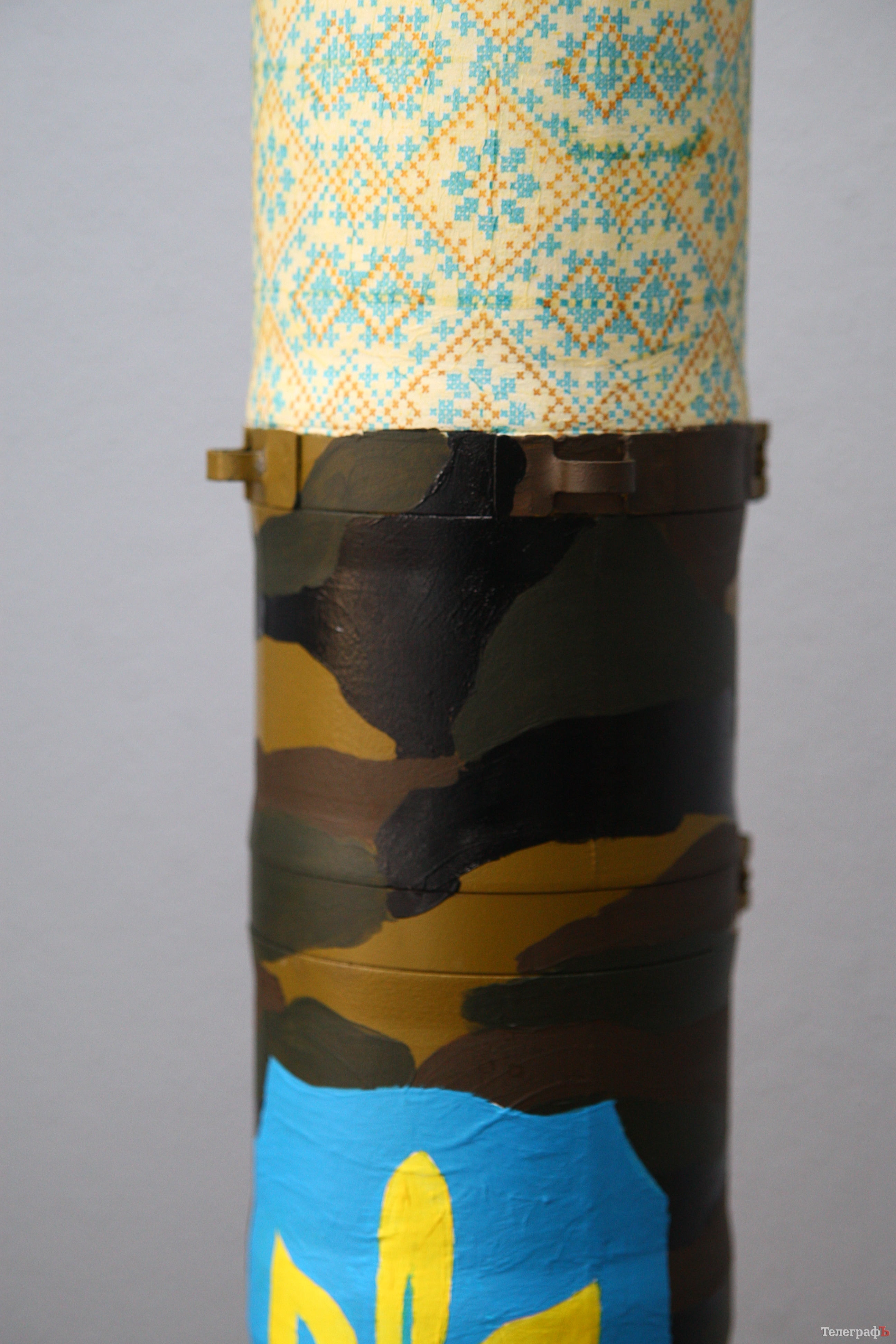 Міна 120-го калібру. Художниця розписала її у вигляді башти донецького аеропорту, у якій несли важку і небезпечну службу військові, в тому числі і кременчужани.