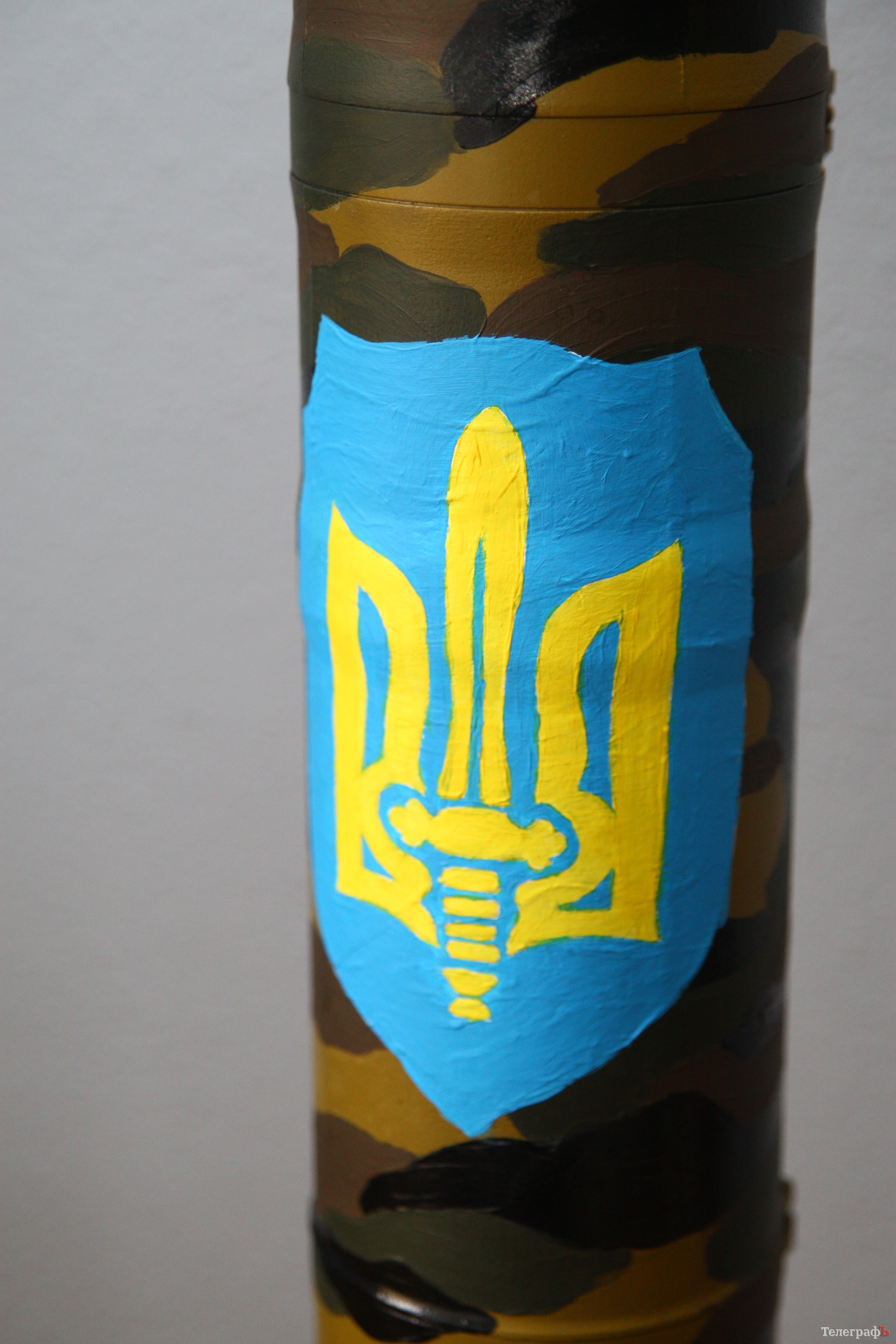 Тубус від протитанкової керованої ракети, що був привезений із зони АТО з міста Дебальцево. ракетою з нього був підбитий ворожий танк сепаратистів, який намагався прорвати оборону військових. Ця ракета врятуала багатьох, тому тубус є дуже символічним...