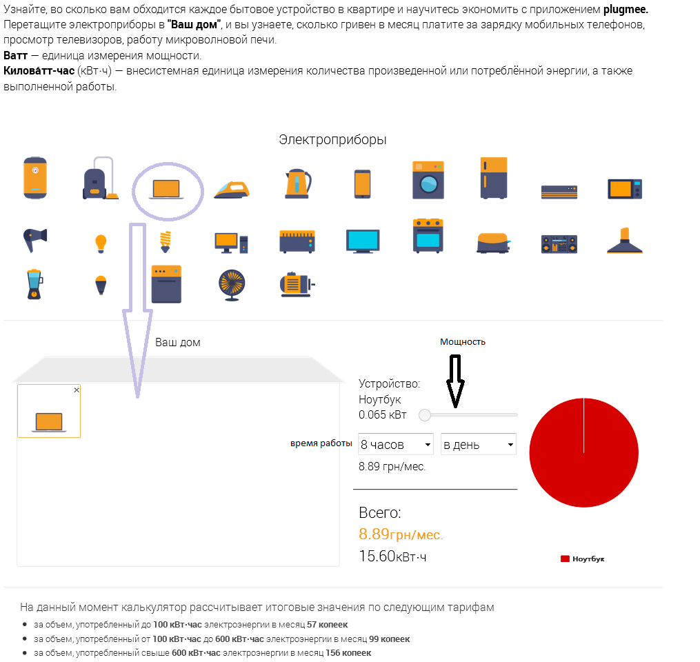 Следующий шаг: в поле "Дом" нужно перетащить все электроприборы, которые есть у вас в жилище. Далее выбирите время работы прибора и его мощность.