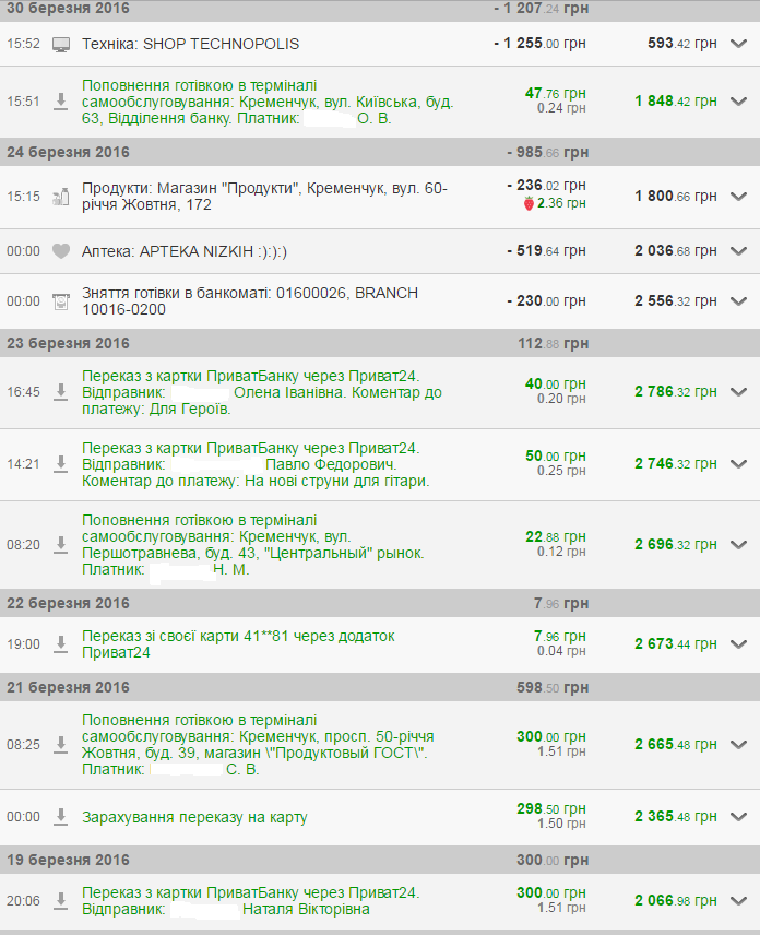 Протягом 22-30 березня кременчужани перерахували на картку 160,64 грн.