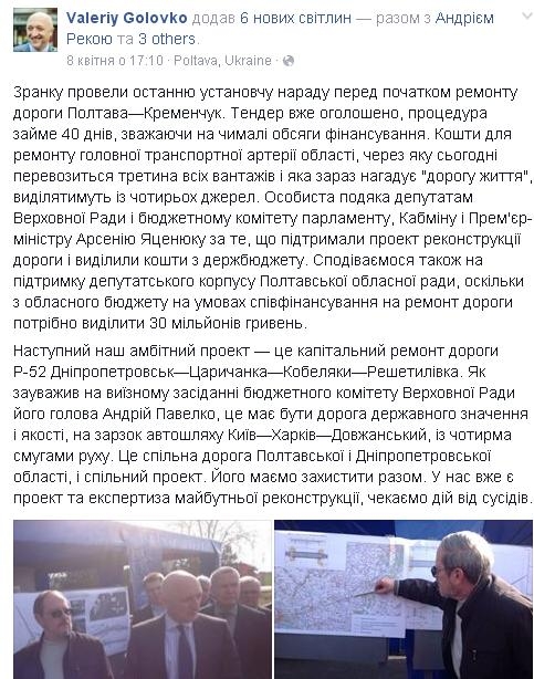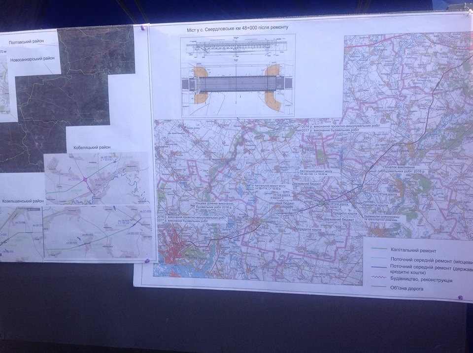 19 квітня 2016 року Полтавська облдержадміністрація та Служба автомобільних доріг мають презентувати і захистити перед депутатами обласної ради обласну програму ремонту доріг загального користування у Полтавській області на 2016-2018 рік. Якщо ж на найближчій сесії депутати виділять необхідну суму грошей, то ремонтні роботи можуть розпочатися і раніше.