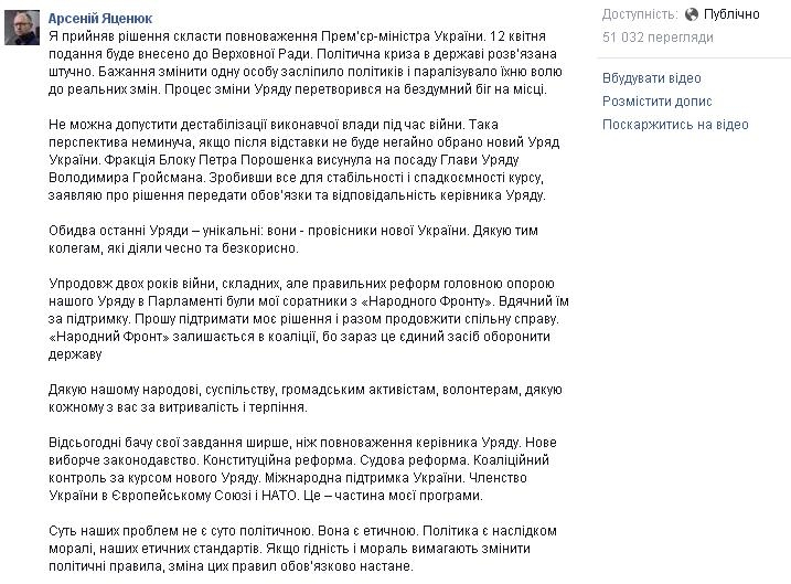 10 квітня Арсеній Яценюк вирішив скласти повноваження Прем’єр-міністра України, інформація про це 2 години тому з'явилась на сторінці політика у Facebook.