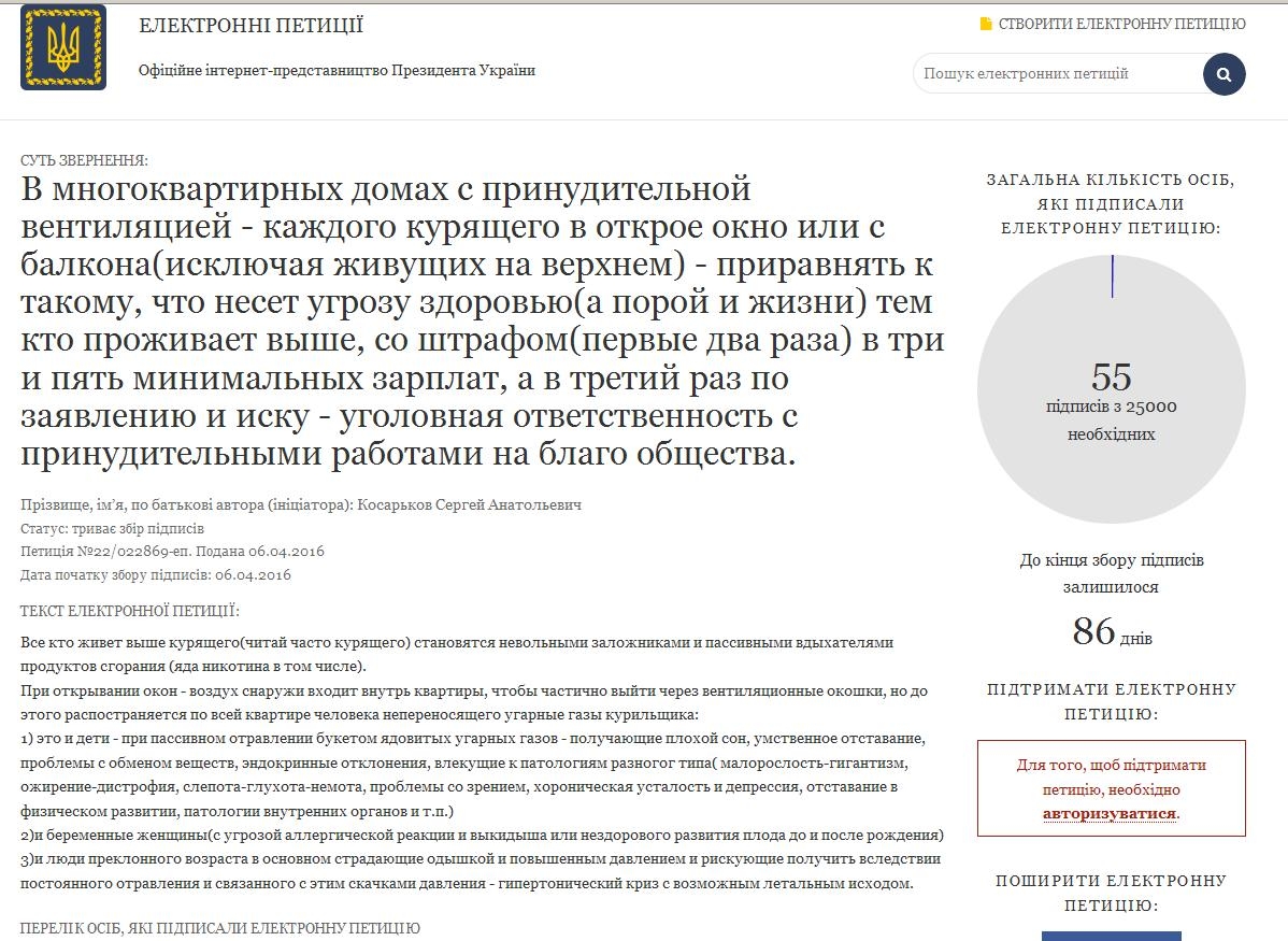 Новая петиция появилась на сервисе электронных петиций Президенту Украины 6 апреля. Инициировал сбор подписей Сергей Косарьков. Автор требует каждого курящего в открытое окно или с балкона в многоквартирных домах приравнять к такому, что несет угрозу здоровью и жизни тех, кто проживает выше.